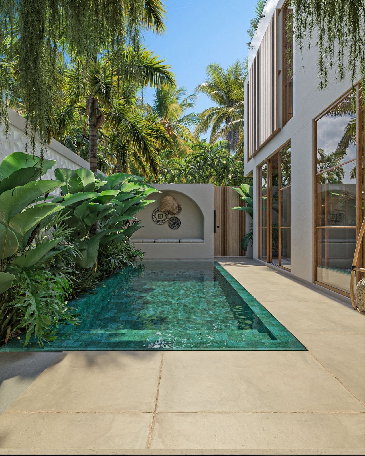 Casa Uluwatu is designed to ensure each villa is a private oasis, with open-plan living areas, a turquoise pool, and lush gardens. The communal areas have tropical landscaping to welcome guests into their holiday homes.
