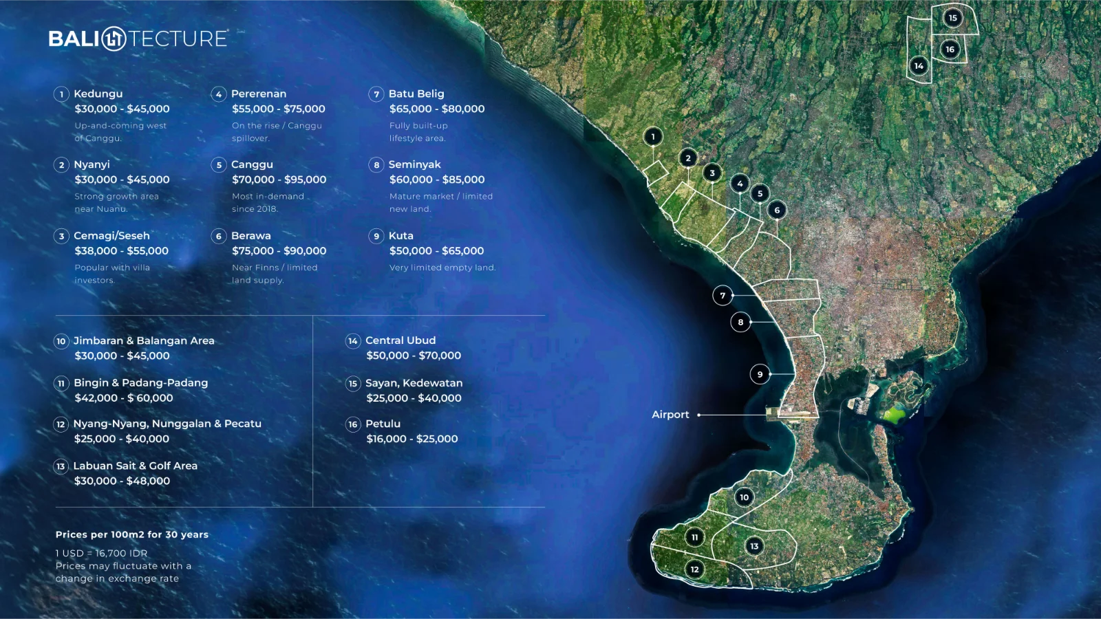 Avoid areas that have hit their peak (Kuta, Seminyak, Berawa, Canggu, Central Ubud). Opt instead for rising areas (Nyang-Nyang, Labuan Sait, Pererenan, Cemagi, Seseh, Nyanyi, Kedungu) for long-term gains.