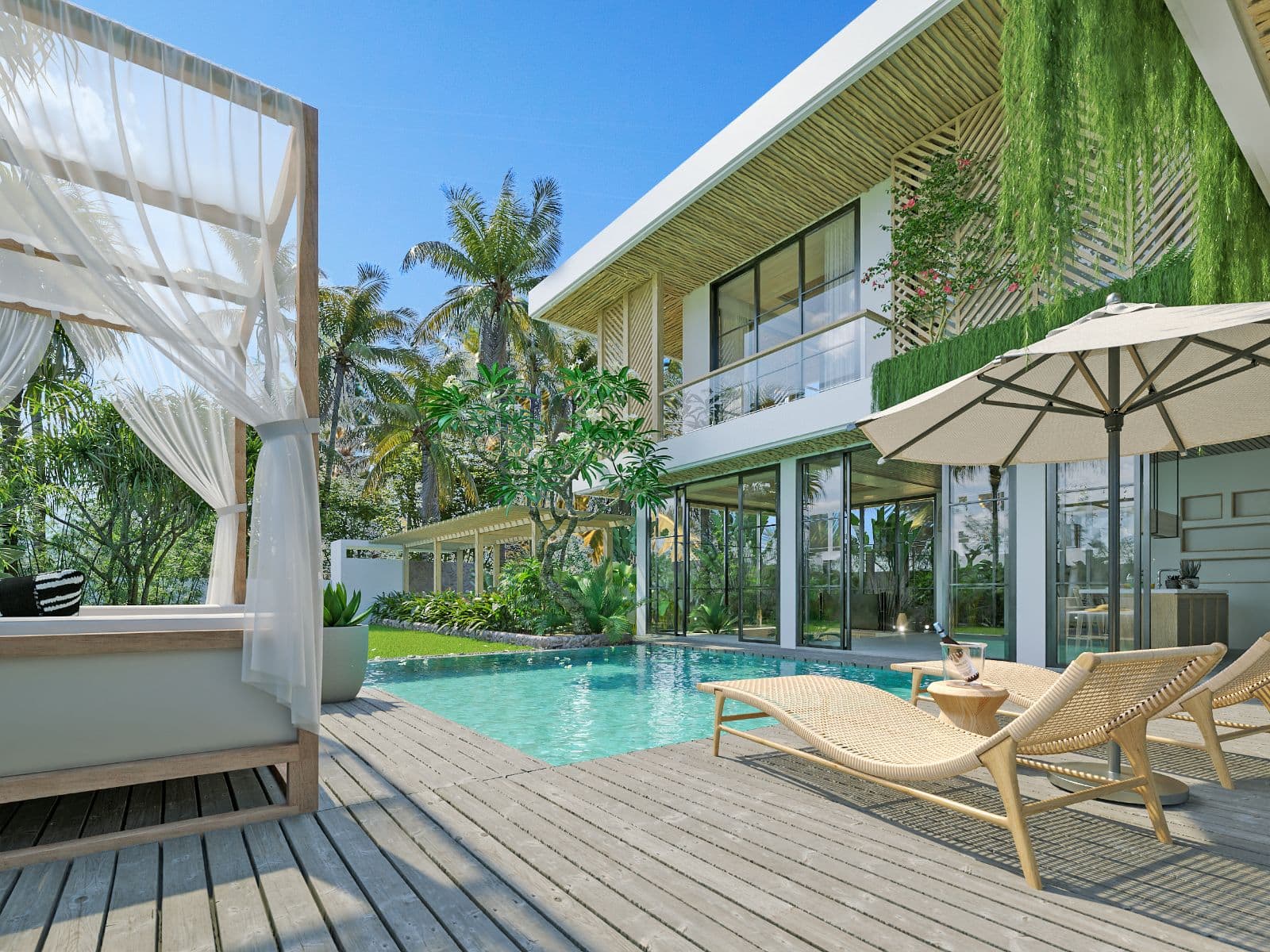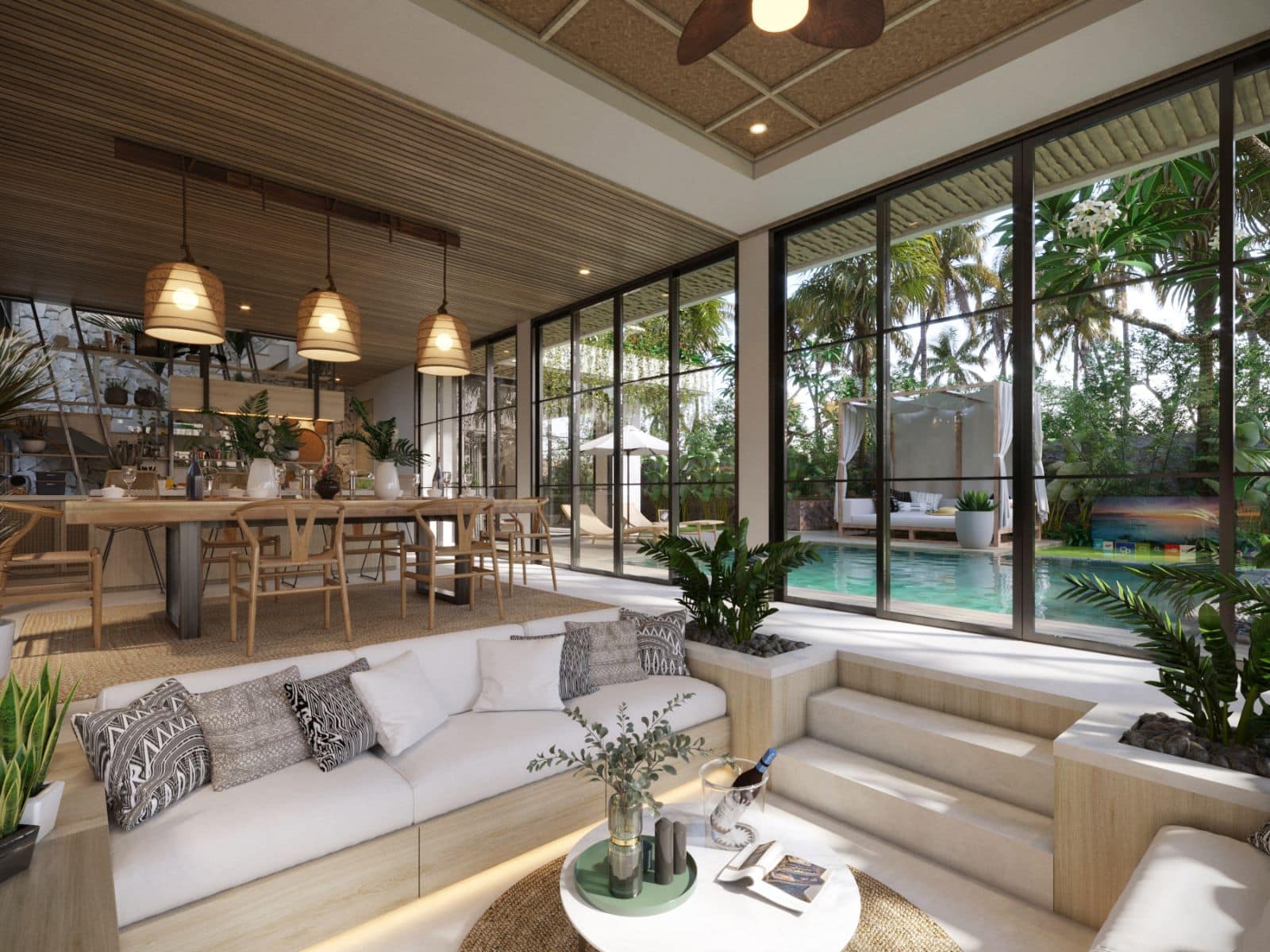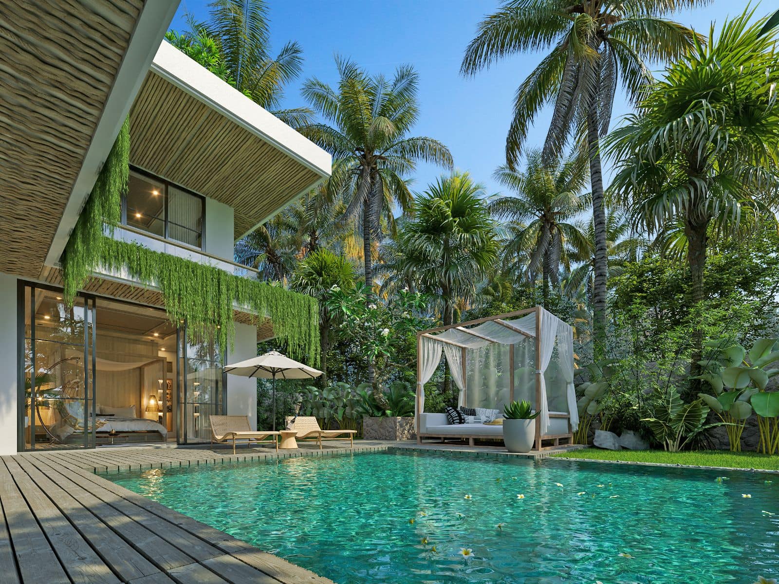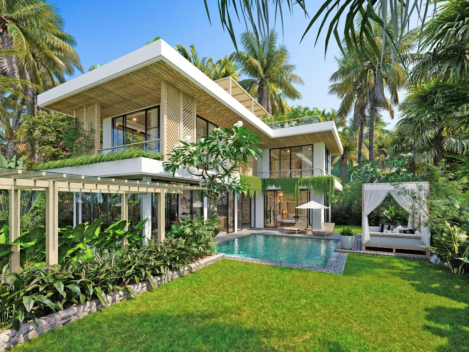 This villa design includes a private pool, which is overlooked by all bedrooms and the living room. There is also a sky terrace and entertainment space located on the roof.