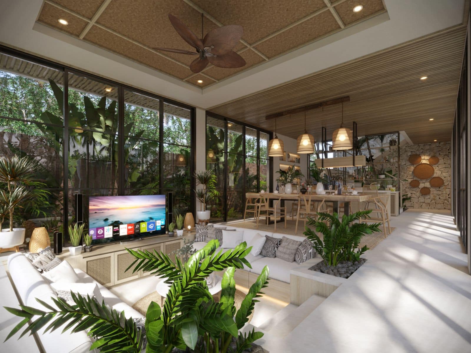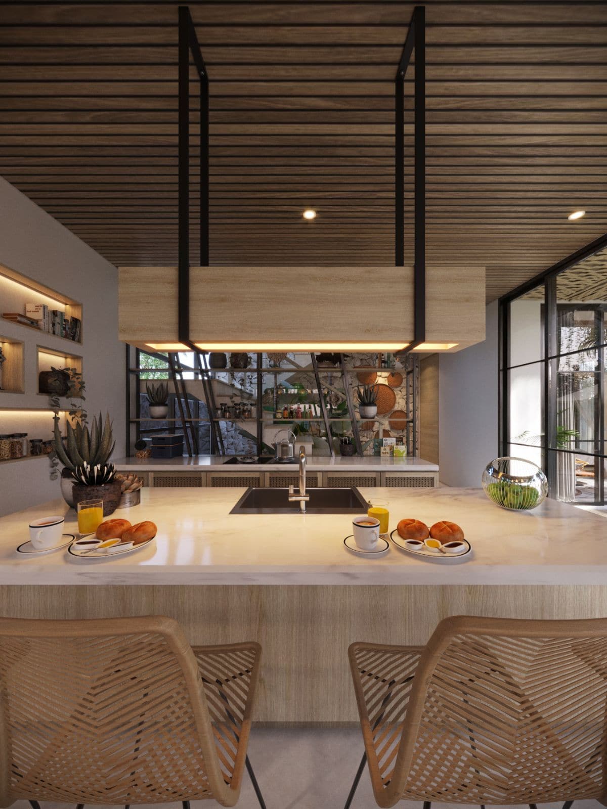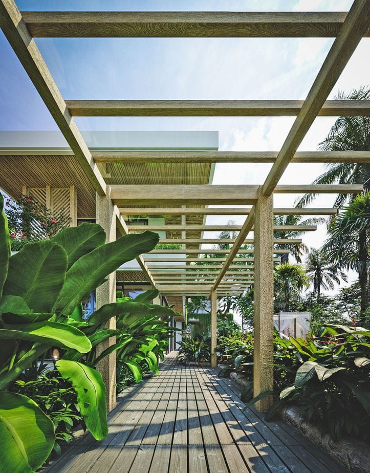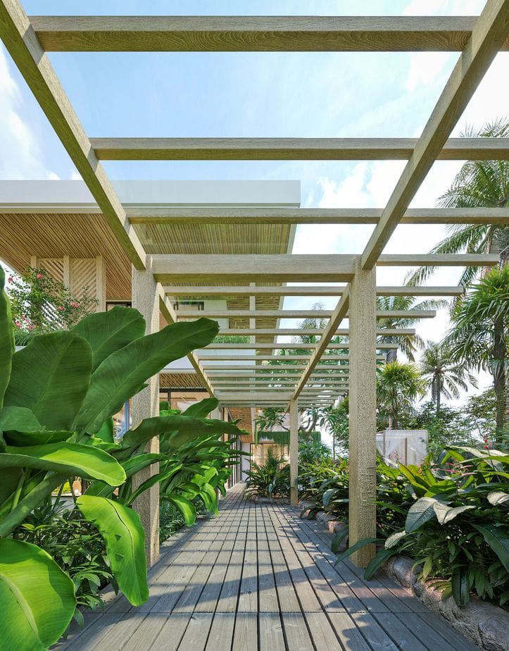 This villa design includes a private pool, which is overlooked by all bedrooms and the living room. There is also a sky terrace and entertainment space located on the roof.