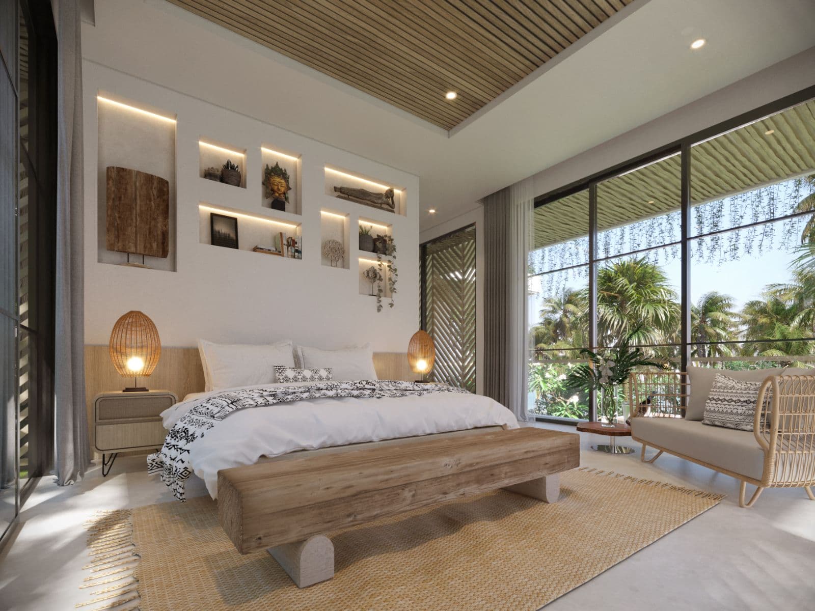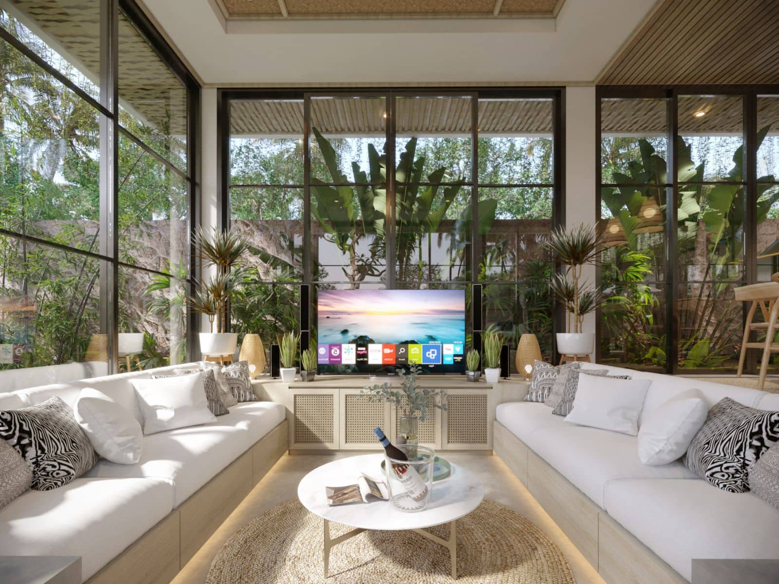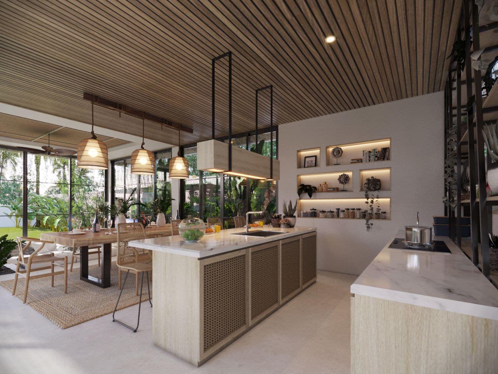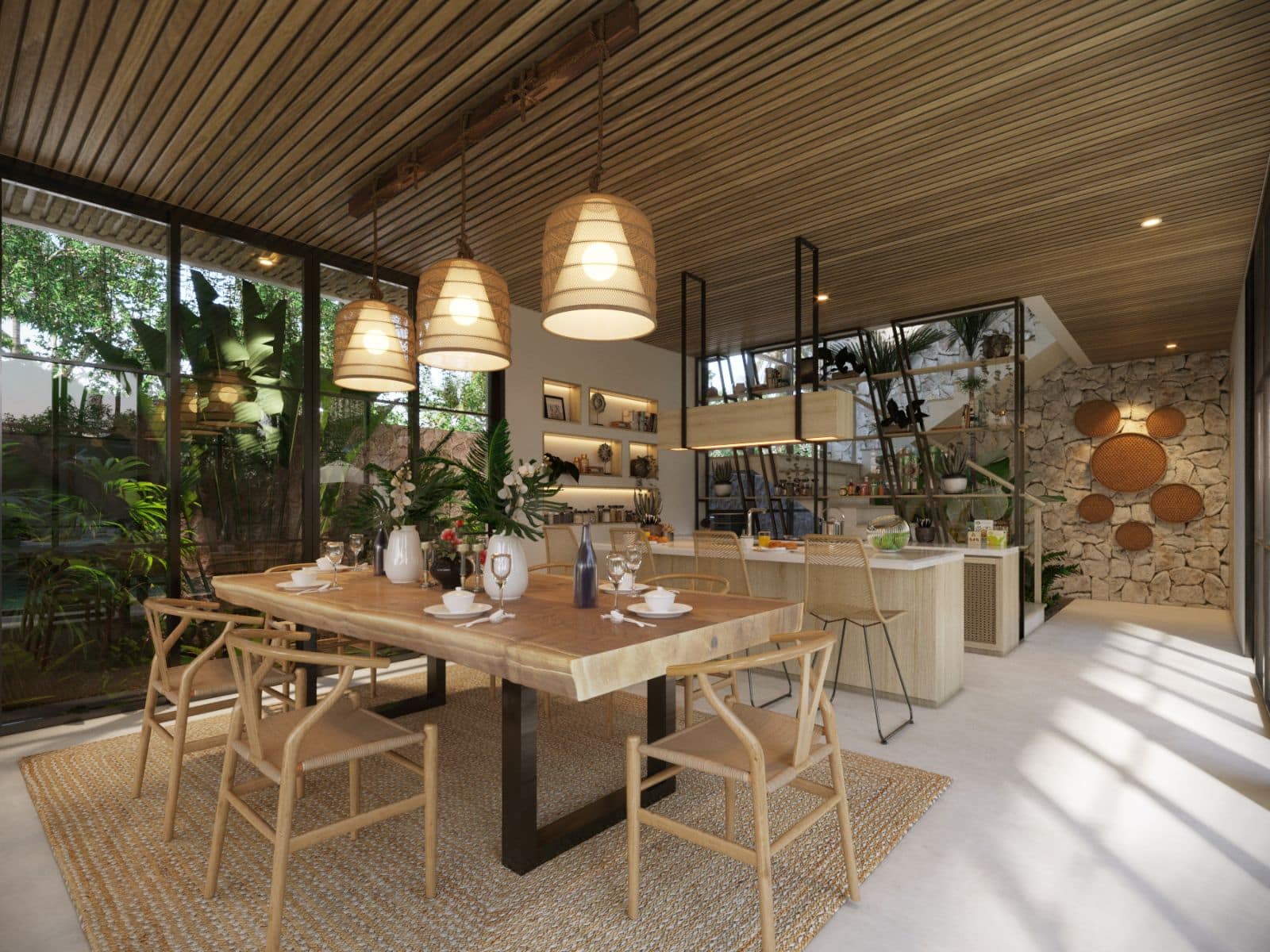 This villa design includes a private pool, which is overlooked by all bedrooms and the living room. There is also a sky terrace and entertainment space located on the roof.