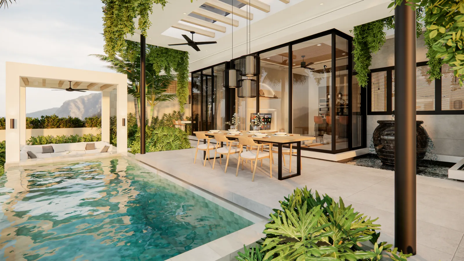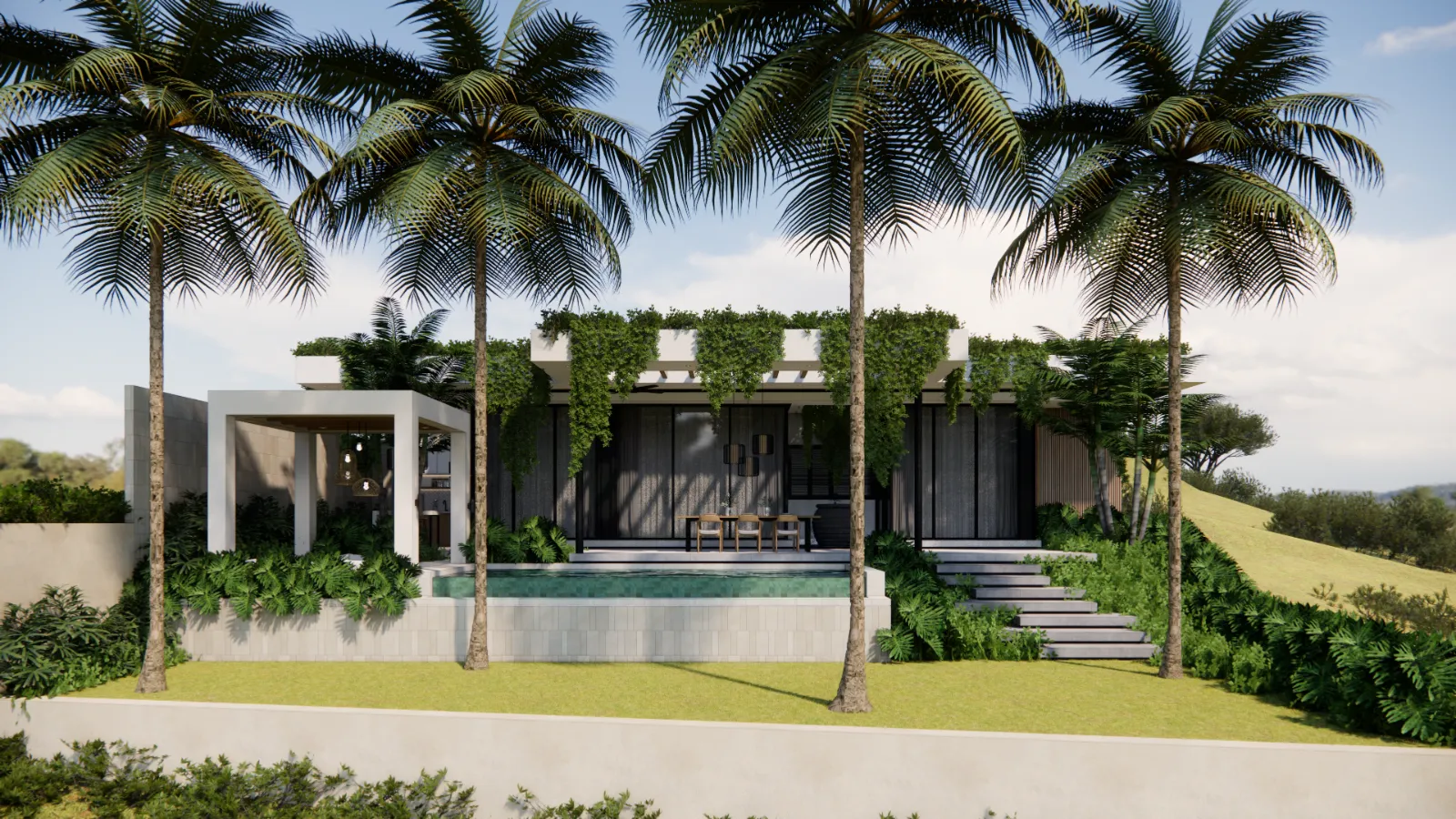 This is the epitome of minimalist blending with tropical design. The flat-roof design paired with clean white walls and floor-to-ceiling black-framed glass brings a super modern vibe, while the lush greenery and warm wooden touches soften it just enough. From the moment you enter, everything feels open, breezy, and easy on the eyes. The layout is practical but never boring, with a seamless indoor-outdoor flow that makes it easy to relax by the pool, host a dinner under the pergola, or just enjoy the sun-soaked living space. The kitchen is sleek and functional, featuring custom cabinetry, statement pendant lights, and bar seating for casual meals or a morning coffee spot.