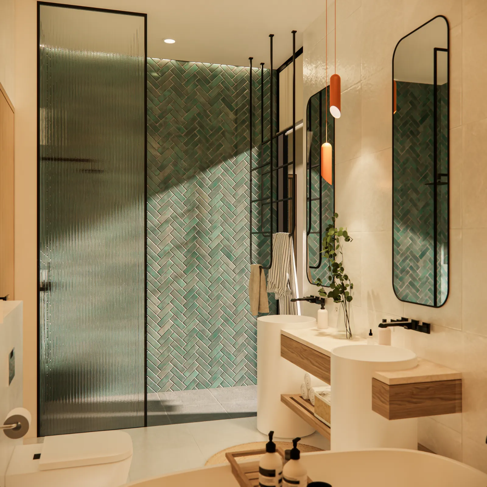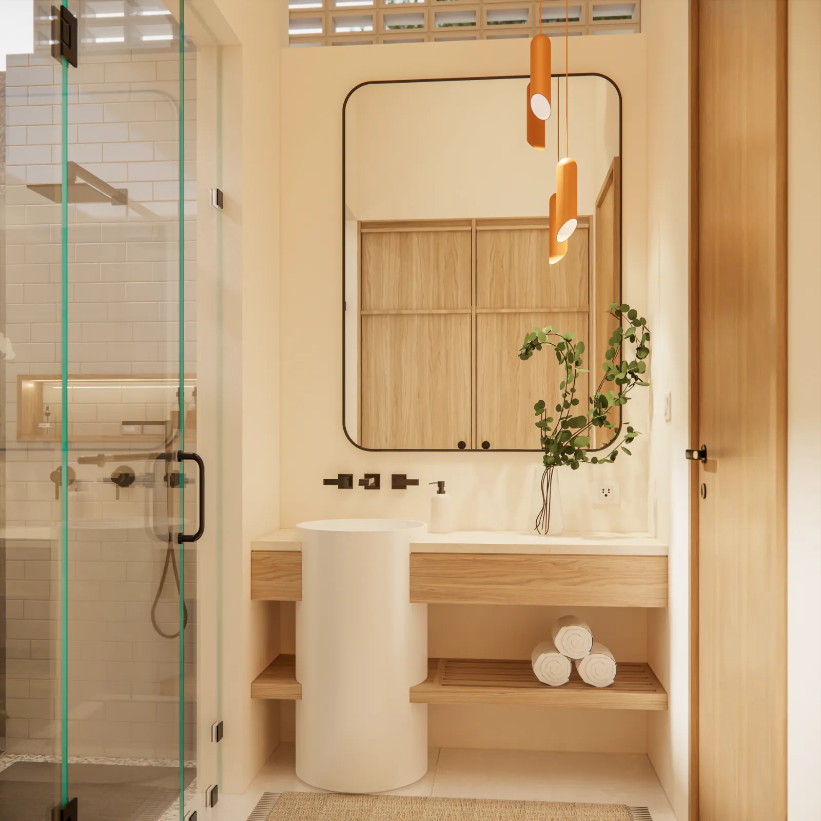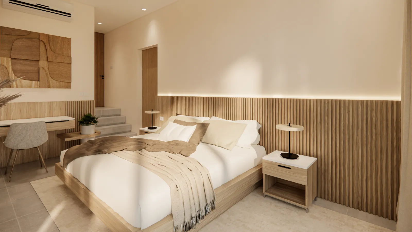 Inside, the palette sticks to soft beige tones, light wood, and subtle textures to create a calm, grounded atmosphere. Bathrooms feel boutique-level, with bold lighting fixtures, terrazzo finishes, and smart space-saving designs like built-in storage nooks and floating vanities. Bedrooms are simple but thoughtful, with sliding doors that open up to garden views and layered textures that keep the space cosy. You’ll also notice clever design choices everywhere, like the glass wall corner in the living area or the wood slat detailing used for privacy and style. It’s a small villa with big design energy, mixing comfort and sophistication without trying too hard.