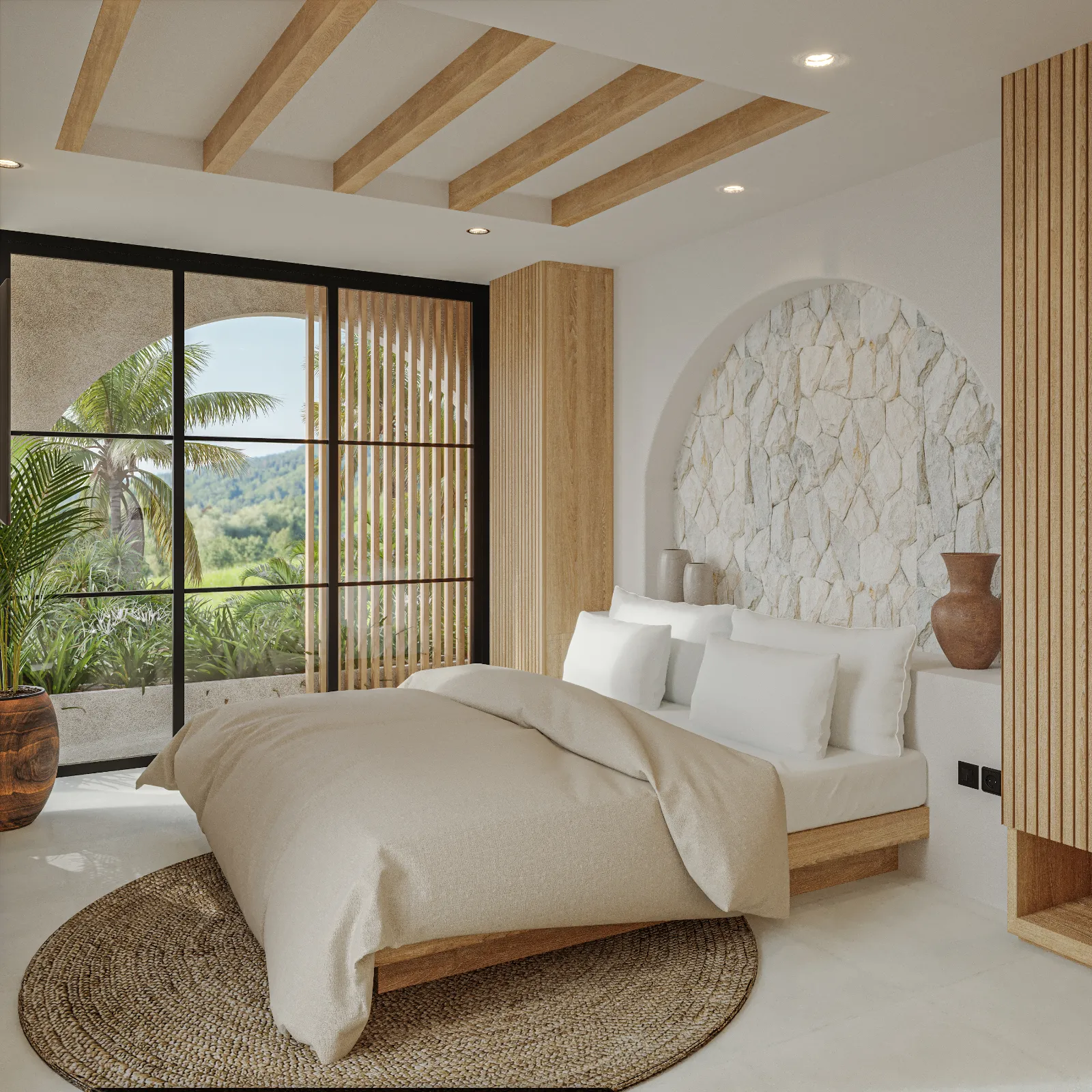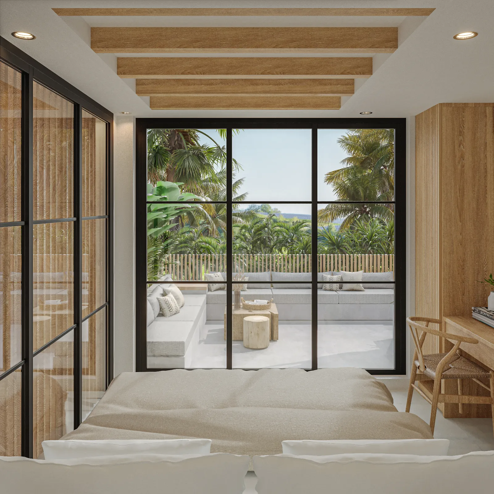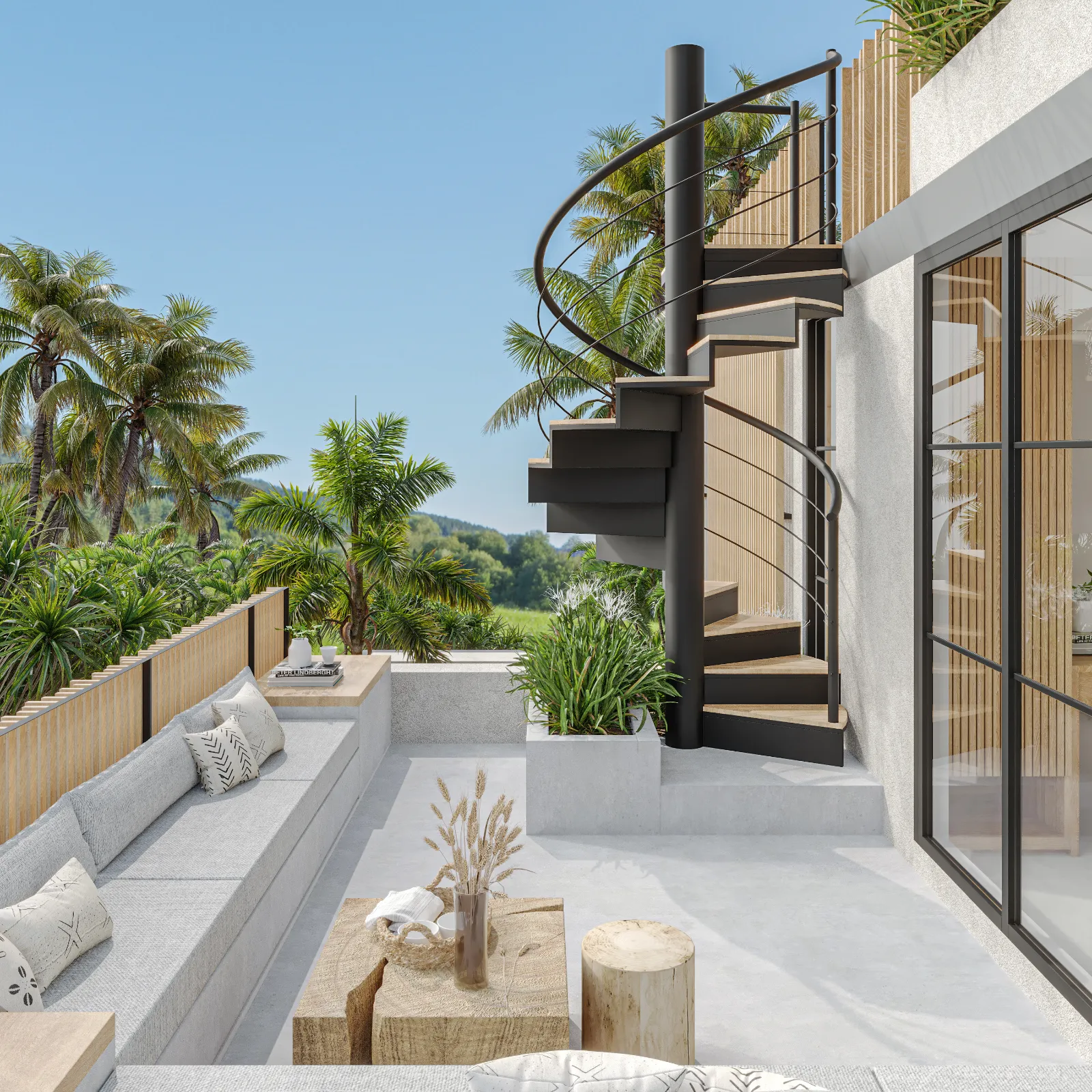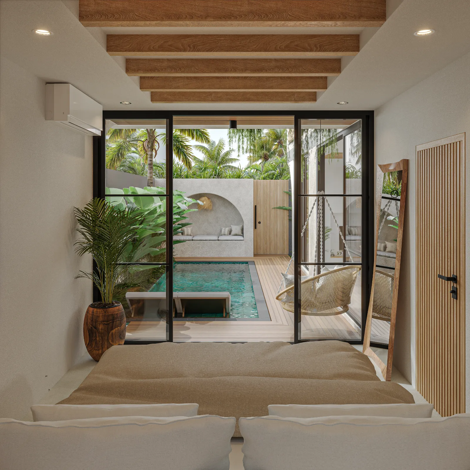 Upstairs, the serene bedrooms feature neutral tones, soft lighting, and private balconies with tropical views. The master suite stands out with its luxurious en-suite bathroom, complete with a freestanding bathtub. And for the ultimate relaxation spot, the rooftop terrace is perfect for morning coffee or unwinding under the stars. Villa Santala isn’t just a stay—it’s a Bali experience.
