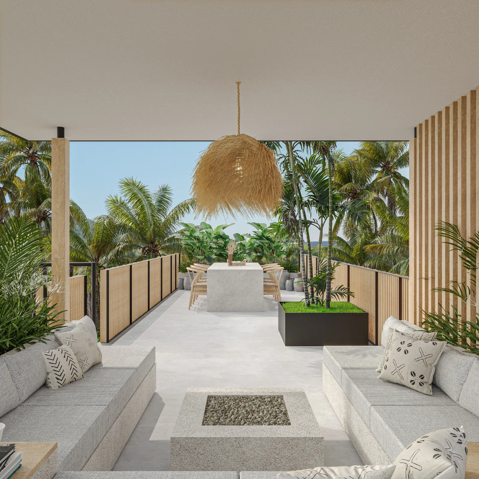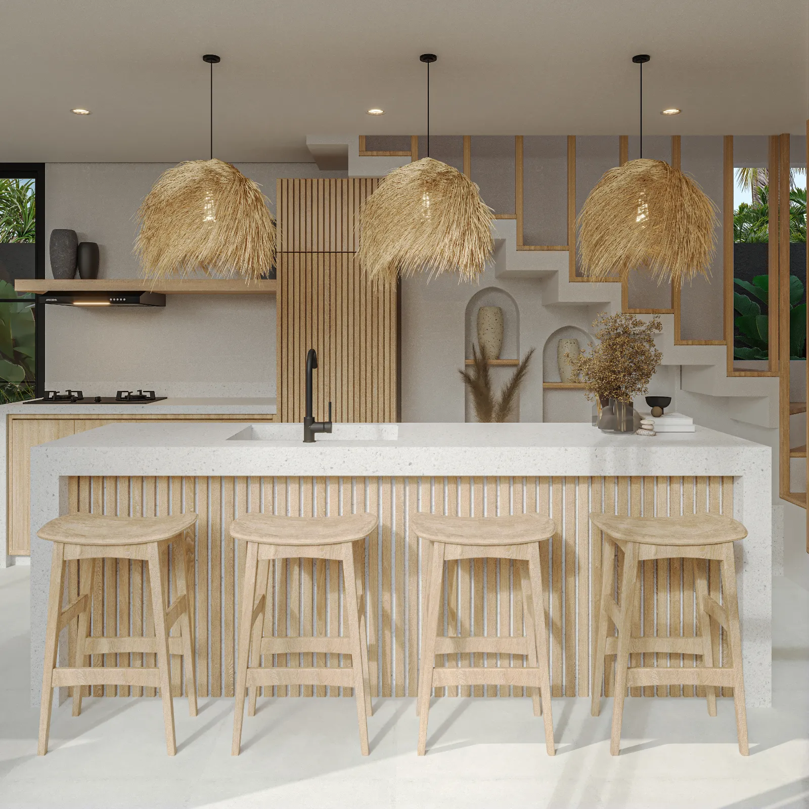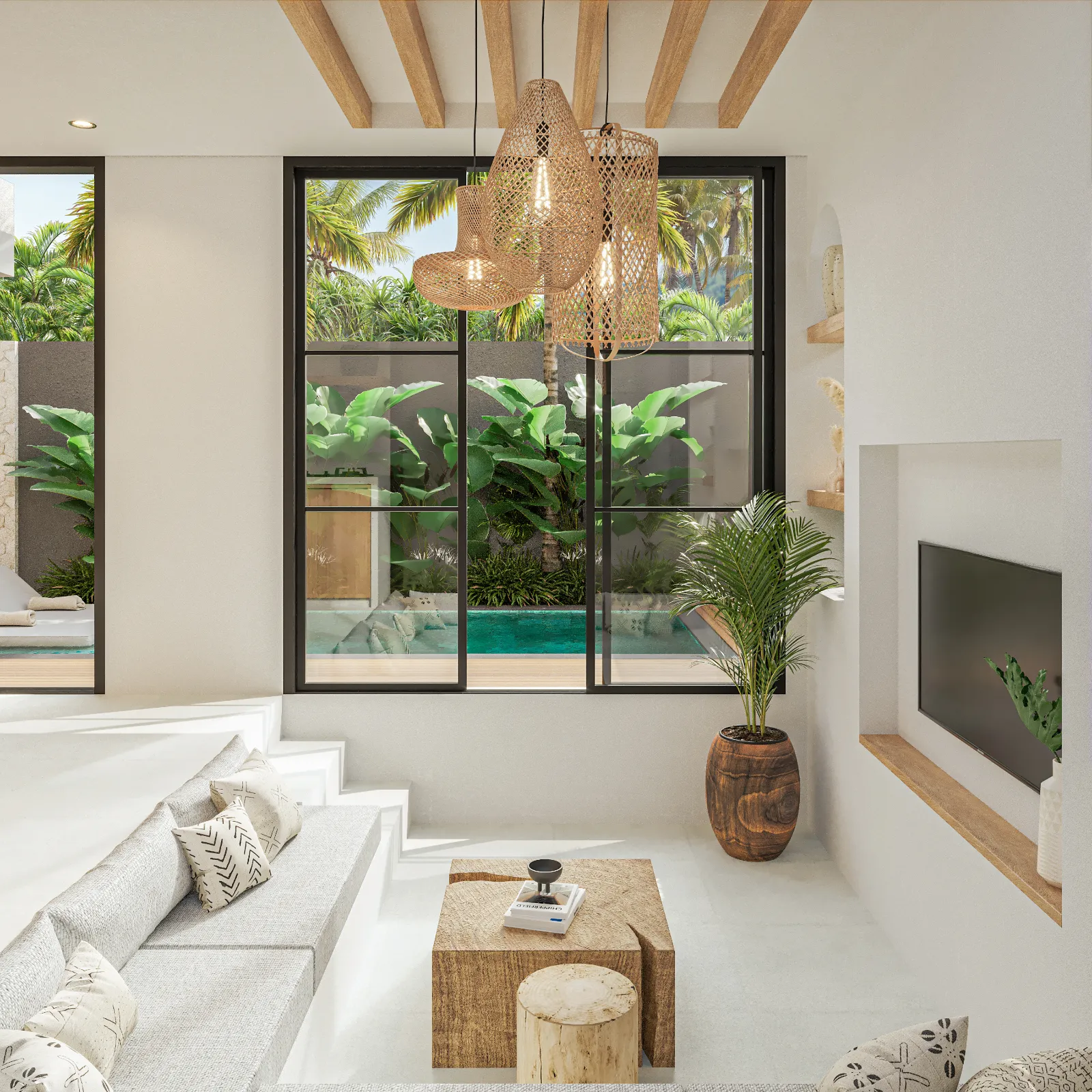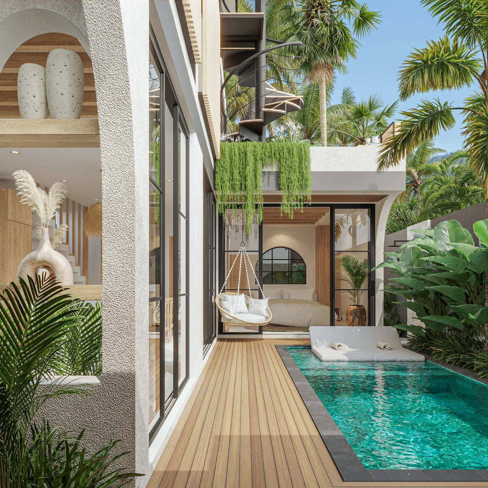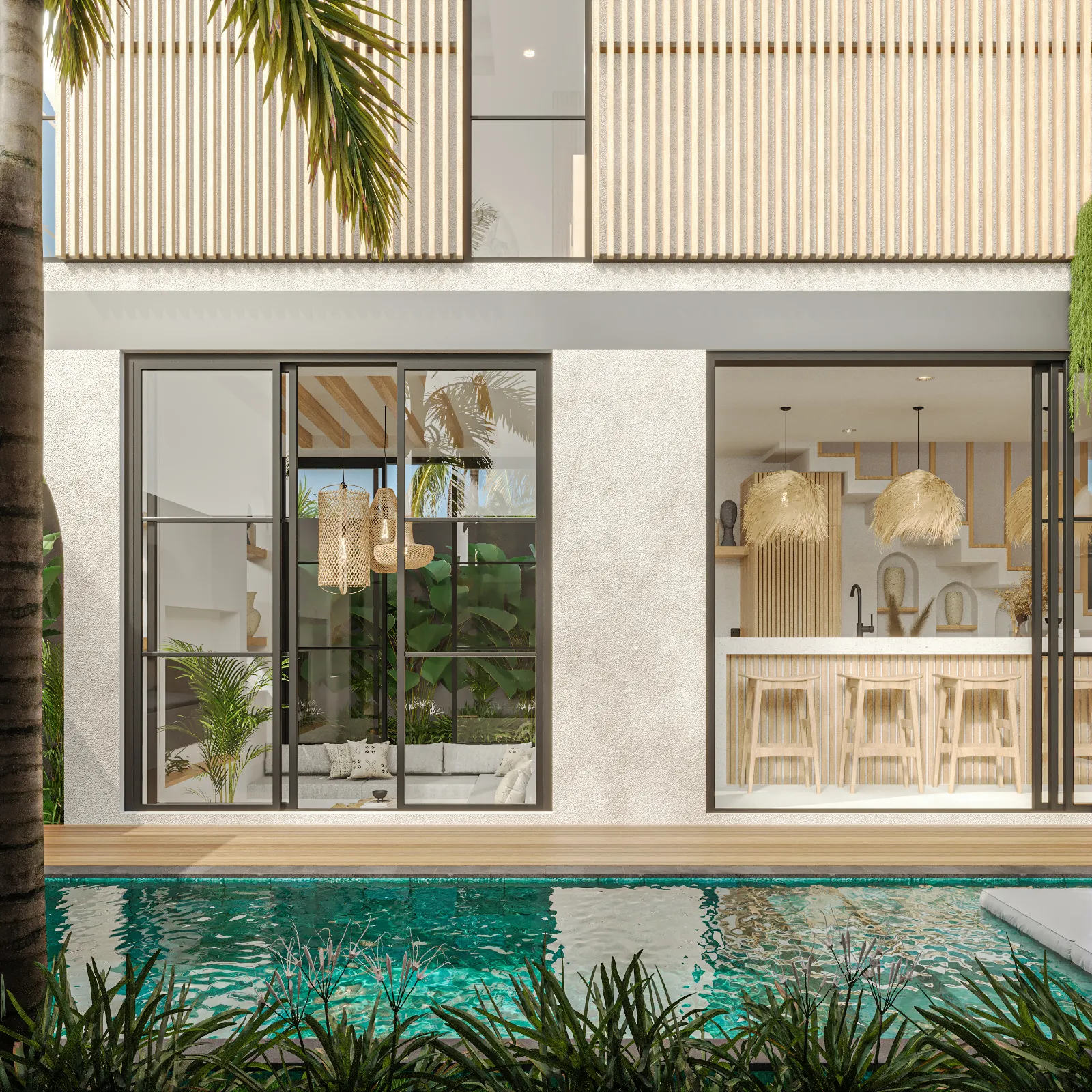 Villa Santala is a stylish three-bedroom retreat that blends modern elegance with tropical charm. The open-plan living area flows seamlessly to the pool deck, creating a bright, airy space with warm wood accents and floor-to-ceiling glass doors. The sleek kitchen, with its statement lighting and spacious island, is perfect for casual meals or entertaining. Outside, the private pool, framed by lush greenery, offers a tranquil escape.