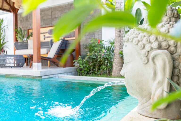 Villa Asli is a luxury 5-bedroom villa which is composed of individual pavilions bought back from Java island, spread around a luxurious garden and natural ponds. These traditional Javanese houses are more than 100 years old and all have been decorated with antiques from all around Indonesia, which brings authentic charm and character to the villa.